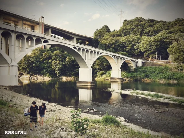 川岸で。