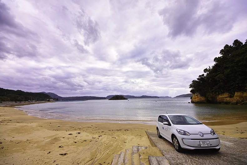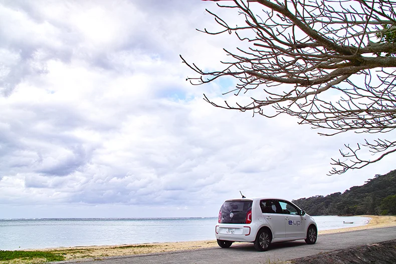 西表島に戻ると e-up! でさらに南下を続けた。目指すは南風見田の浜(はいみだのはま)。昨日訪れた白浜の真反対となる行き止まり地点なのだ。いくつもの美しいビーチと力強いマングローブを抜けて行くが、低重心の e-up! はワインディングロードでも安定していて走りやすい。ボディの四隅に踏ん張るように配置されたホイールも車幅がわかりやすくていい感じ。ときおりギアセレクターを操作して、急な下り坂の時は回生ブレーキの効きを強くして充電しながら走った。窓を全開にして、車外の波の音や風の音を聞きながらドライブできるのは本当にスゴいと思う。今回は一人でのドライブだったが、e-up! の開放感ある室内空間も魅力だ。広々としたキャビンはファミリーでのドライブでも快適に違いない。仲間とワイワイと出かけるのも楽しそうだ。
