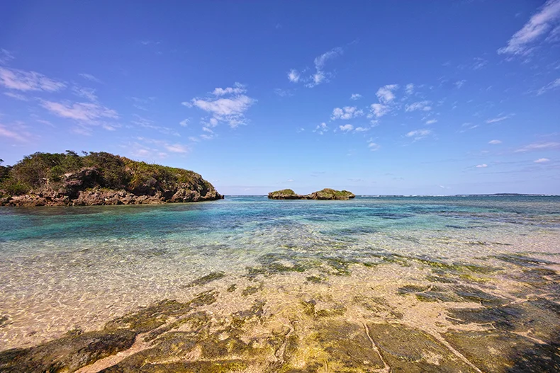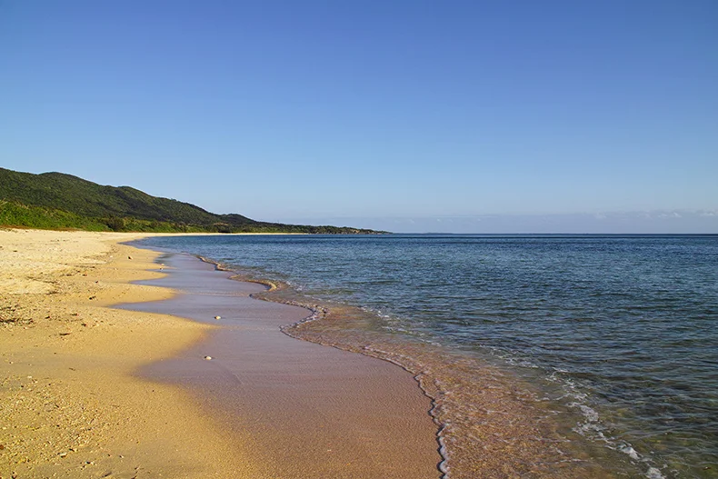 翌朝は素晴らしいお天気になった。これは嬉しい!さっそく美しいビーチを撮るべく「星砂の浜」に向かうことに。リゾナーレ西表島を通り過ぎて住吉の集落に入り、土産物店脇の坂を下りるとそのビーチはあった。誰もいない海は風と波の音だけの世界である。星の砂を探すのも忘れて、水平線をただただ見つめていた。