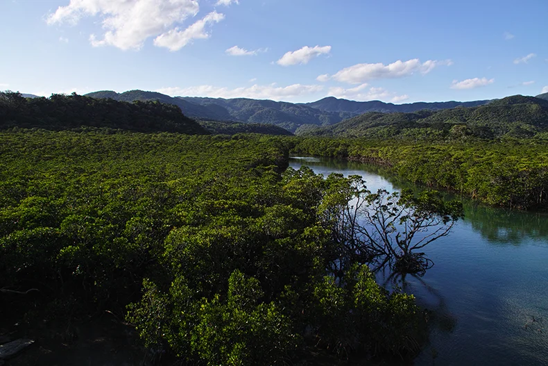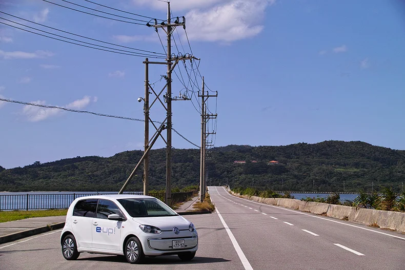 南国リゾートムード満点の「星野リゾート リゾナーレ 西表島」でフォルクスワーゲン e-up! とご対面。コンパクトで扱いやすそうなボディに、キリリとスマートなフェイスが頼もしい。スタッフからレクチャーを受けてから、充電済の e-up! で八重山諸島最大の島を走り出した。まずは島の西側を目指してみよう。