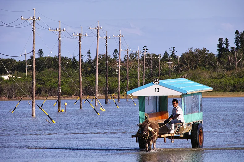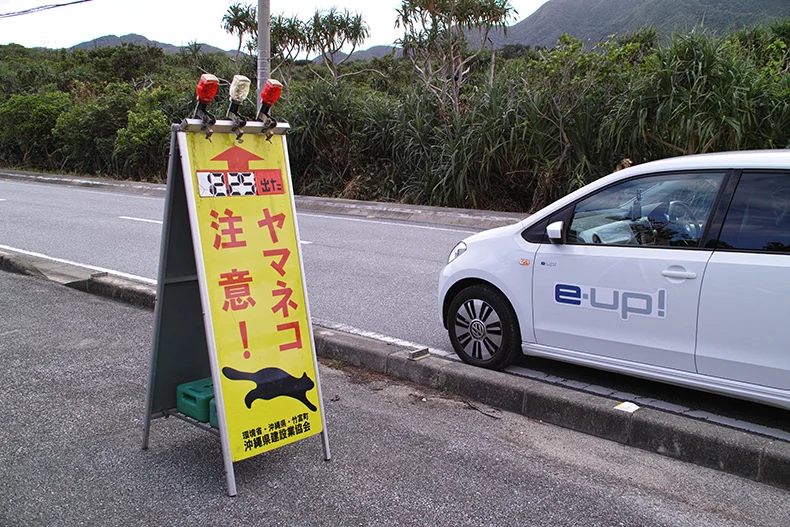 さて午後は島の南部を探索しに行こう。船浦の海中道路を過ぎ、まずは由布島に向かってみることに。途中、西表島らしい「イリオモテヤマネコ出没看板」をいくつも見かけた。この周囲はクルマが通過するときに音が発生する特殊舗装がされており、イリオモテヤマネコがクルマに気付く配慮がされている。また道路下には動物専用の横断トンネルがいくつも設置されているとのことだ。そういえば、西表島では渋滞がないが、この e-up! には「シティエマージェンシーブレーキ」という安心装備が標準搭載されている。これは時速30キロ未満での走行中に、センサーが前方の車両や障害物を検知して自動的にブレーキがかかるというもの。これは安心である。
