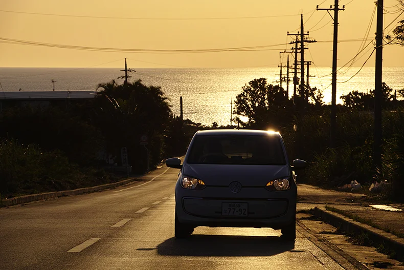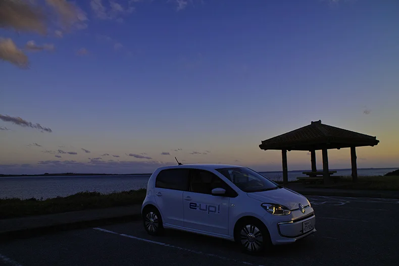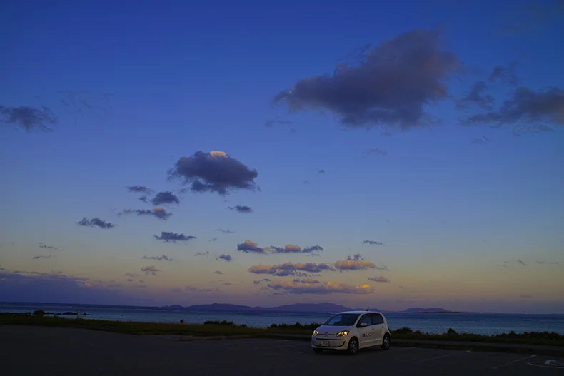 さて陽もとっぷり暮れたので帰ることにしよう。だいぶ走ったのでバッテリーの保ちも気になったが、まだまだ余裕だということをメーターが知らせてくれた。期待以上に走ってくれた e-up! 。おかげで存分に西表島を楽しむことができた。お隣の小浜島にも同様な企画があるようなので、機会があれば訪れてみたいものだ。でも、できることならば e-up! で日本全国をブラブラと撮影ドライブできたらいいな、と思いながらリゾナーレ西表島に向けてステアリングを切った。もちろん窓は開けたまま。波と風の音を聞きながら。