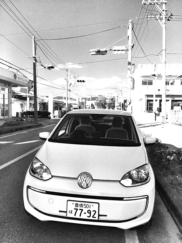 e-up! はシンプルでムダのないフォルムが美しい。コンパクトなスタイルもどことなく愛嬌があるので、つい写真に撮りたくなってしまう。広いパーキングに e-up! を停めて、シャープなヘッドライトをキーに、ボンネットのプレスラインを入れ込んでシャッターを切った。造形的に優れた被写体はどこを切り取っても美しい。