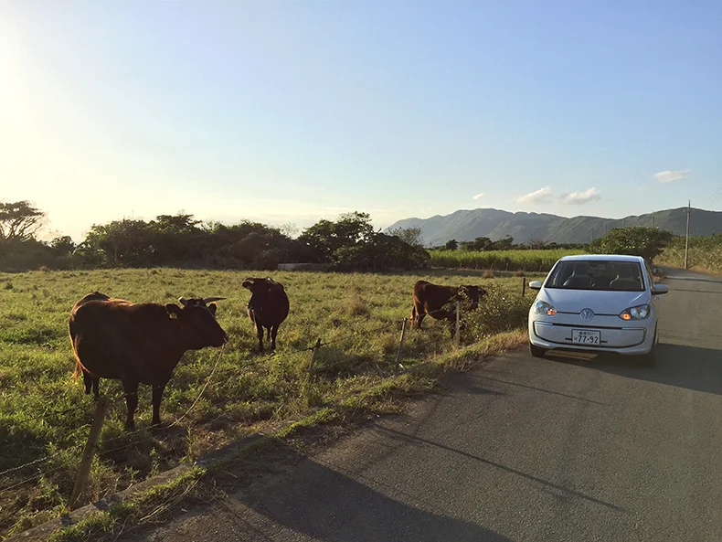 南風見田の浜でイヌとお別れして、夕暮れの島をリゾナーレ西表島に向かう。途中の放牧場ではたくさんのウシが草を食んでいた。静かな e-up! ならばすぐ横に停めても逃げることがない。ここでも iPhone 6 Plus で撮影だ。こういう逆光気味の時は「HDR」を ON にして撮ろう。そうすると明るい部分と暗い部分の描写のバランスがよくなりキレイに仕上がるからだ。ウシとの記念写真を収めたあとはひたすら北上を続けた。